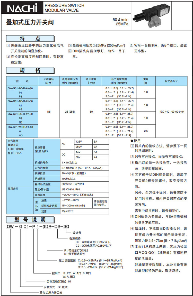 OW-G01-PC-R-D2-30,OW-G01-A1-R-C2-30,OW-G01-B3-R-C2-30,OW-G01-W3-R-D2-30,NACHI疊加式壓力開關閥