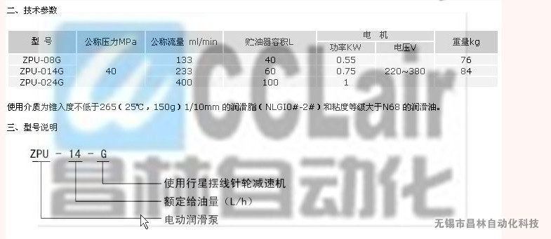 一、使用條件ZPU型電動潤滑泵適用于潤滑頻率高,配管長度大,潤滑點密集,公稱壓力為40MPa的單、雙線干油集中潤滑系統(tǒng)中,作為供送潤滑脂的輸送裝置。還可配備移動小車、高壓膠管、給脂油槍和電纜組成移動式電動潤滑泵裝置,專用于潤滑頻率低、潤滑點少、給油量大且不便于采用集中潤滑的單機設備上進行移動給油潤滑。