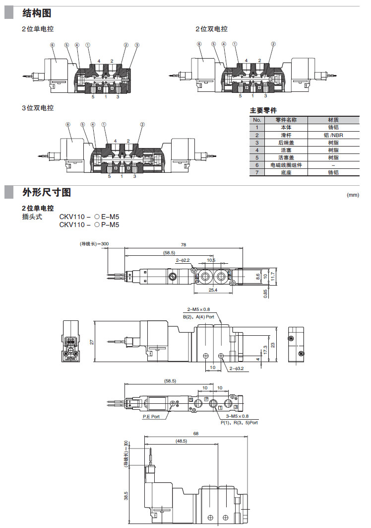 CKV110-B-1E,CKV120-B-2E,CKV130-B-4E,CKV140-B-4P,CKV150-B-1E,5通先導式電磁閥
