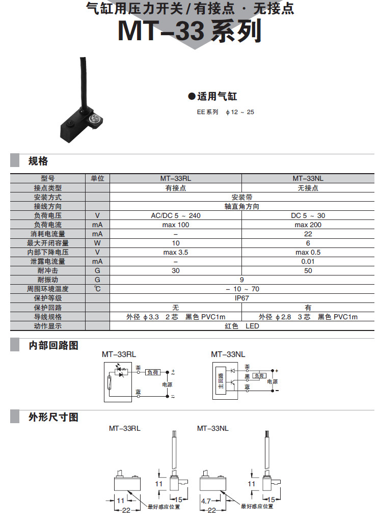 詳細(xì)信息 MT-33RL,MT-33NL,氣缸用壓力開關(guān)