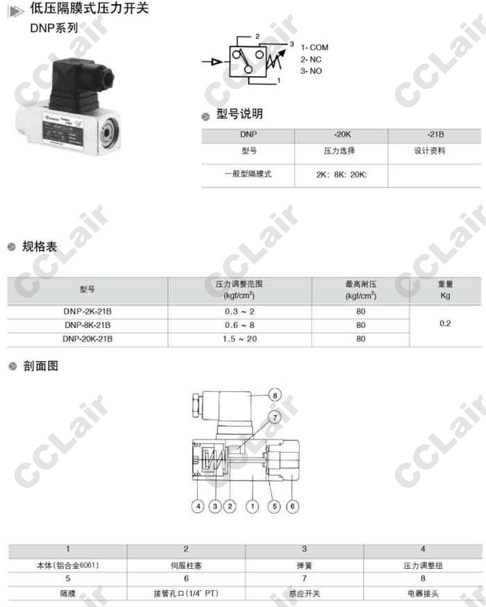 » DNP-2K-21B,DNP-8K-21B,DNP-20K-21B,低壓隔膜式壓力開關