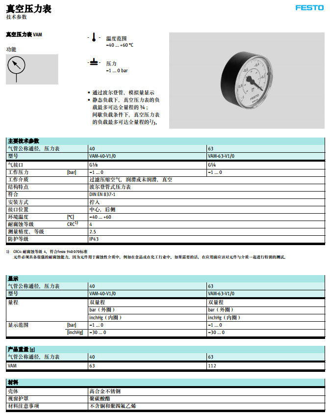 VAM-40-V1/0-1/8-CT,VAM-63-V1/0-1/4-CT,festo真空壓力表