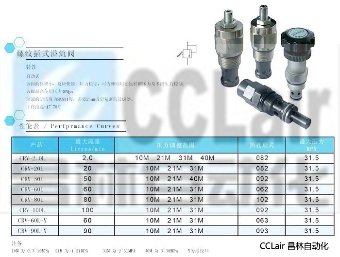 CRV-2.0L,CRV-20L,CRV-50L,CRV-60L,CRV-80L,CRV-100L,CRV-60L-Y,CRV-90L-Y,螺紋插式溢流閥
