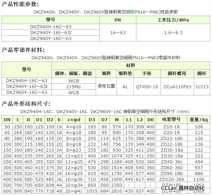 DKZ940H、DKZ940Y、DKZ960Y 型 PN16~PN63 真空閘閥驅(qū)動方式為電動,連接方式為法蘭連接(DKZ960Y 為對接焊連接)、明桿楔式彈性閘板,閥座密封面材料為不銹鋼或硬質(zhì)合金,公稱壓力 PN16~PN63,閥體材料為碳鋼(DKZ940H-16C~63、DKZ960Y-16C~63)、Cr5Mo(DKZ940Y-16I~63I)的真空閘閥。