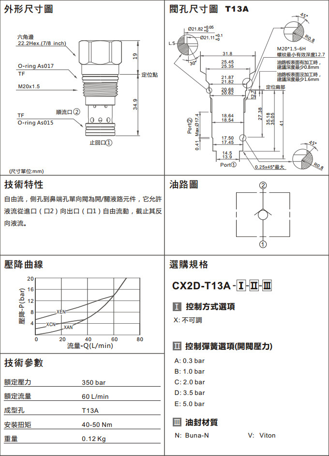 詳細信息 CX2D-T13A-XAN,CX2D-T13A-XBN,CX2D-T13A-XCV,CX2D-T13A-XDV,CX2D-T13A-XCN,CX2D-T13A-XDN,CX2D-T13A-XEN,CX2D-T13A-XAV, CX2D-T13A-XBV,CX2D-T13A-XEV,單向閥(口2通口1自由流)