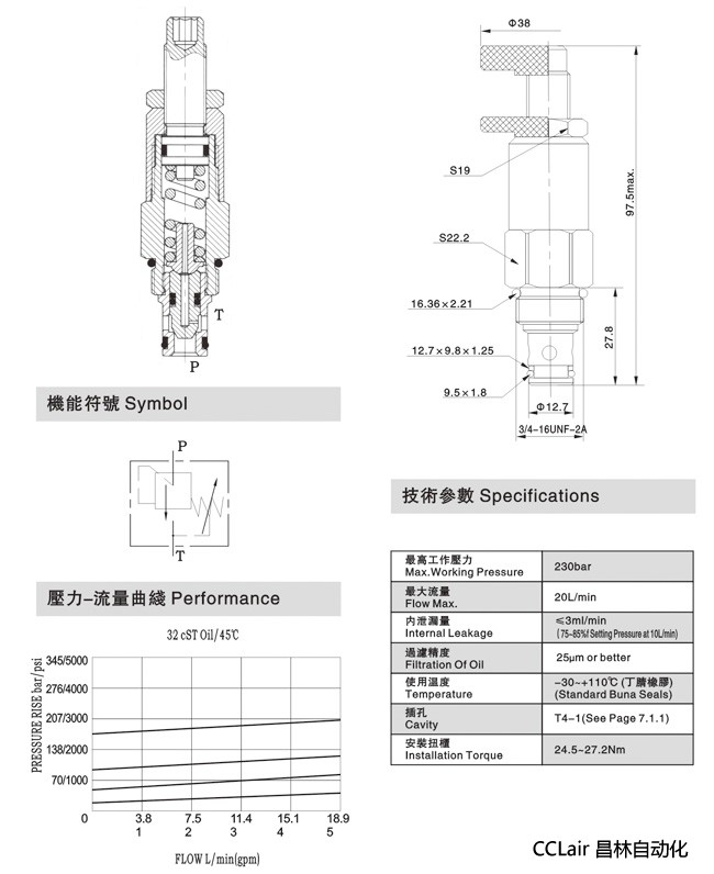 液壓閥技術參數(shù): 最高工作壓力:230bar 最大流量:20L/min 內泄漏量:≤3ml/min 過濾精度:25μm or better 使用溫度:-30~+110℃ 插孔:T4-1 安裝扭矩:24.5-27.2Nm
