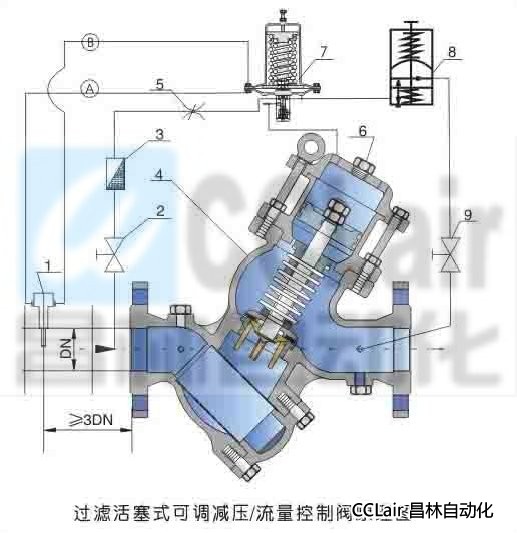 1.畢托管 2.球閥 3.過濾器 4.主閥 5.針閥 6.開度指示器 7.限流導(dǎo)閥 8.減壓導(dǎo)閥 9.球閥