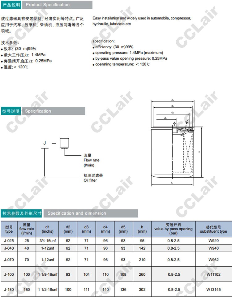 詳細(xì)信息 J-025,J-040,J-070,J-100,J-180,旋轉(zhuǎn)式機(jī)油過濾器