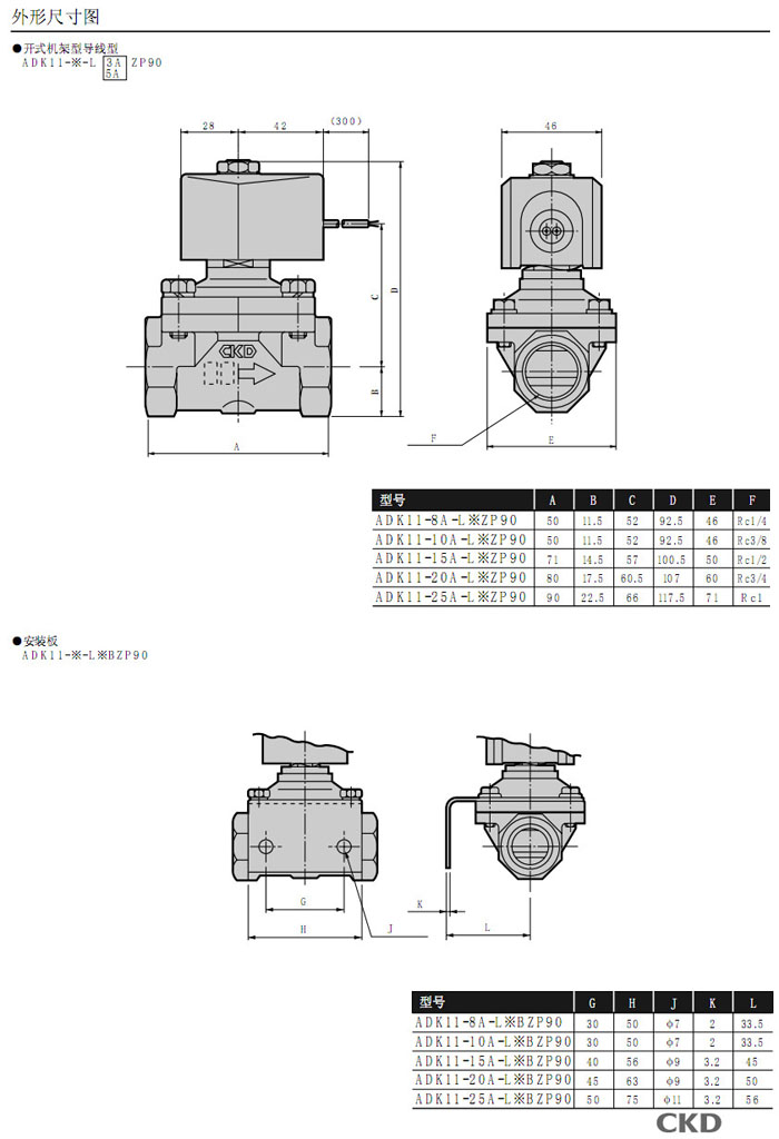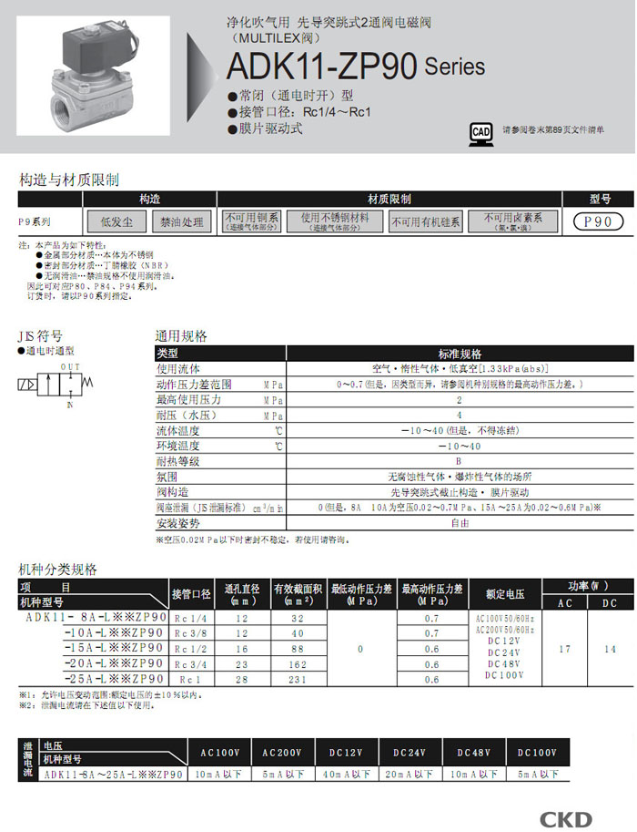 詳細信息 ADK11-8A-L3A,ADK11-10A-L3A,ADK11-15A-L3A,ADK11-20A-L3A,ADK11-25A-L3A,CKD先導式2通電磁閥