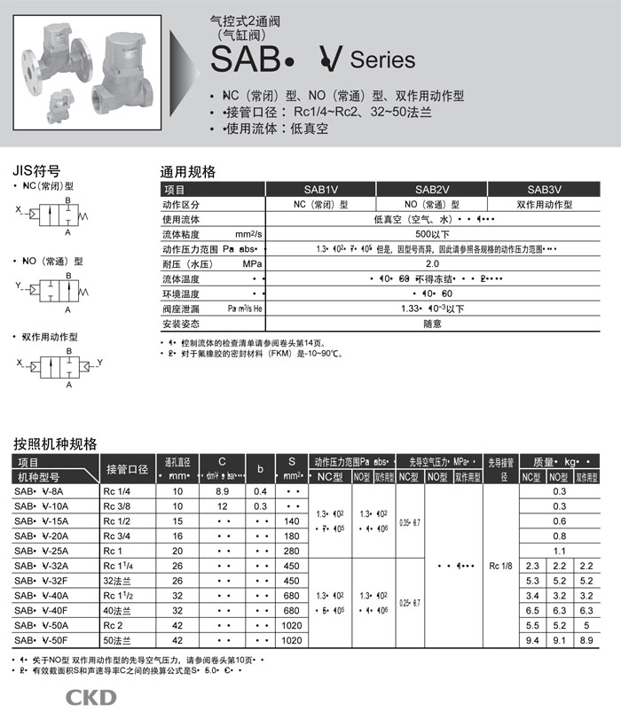 SAB2V-32A,SAB2V-32F,SAB2V-40A,SAB2V-40F,SAB2V-50A,SAB2V-50F,SAB3V-8A,SAB3V-10A,CKD氣控式2通閥