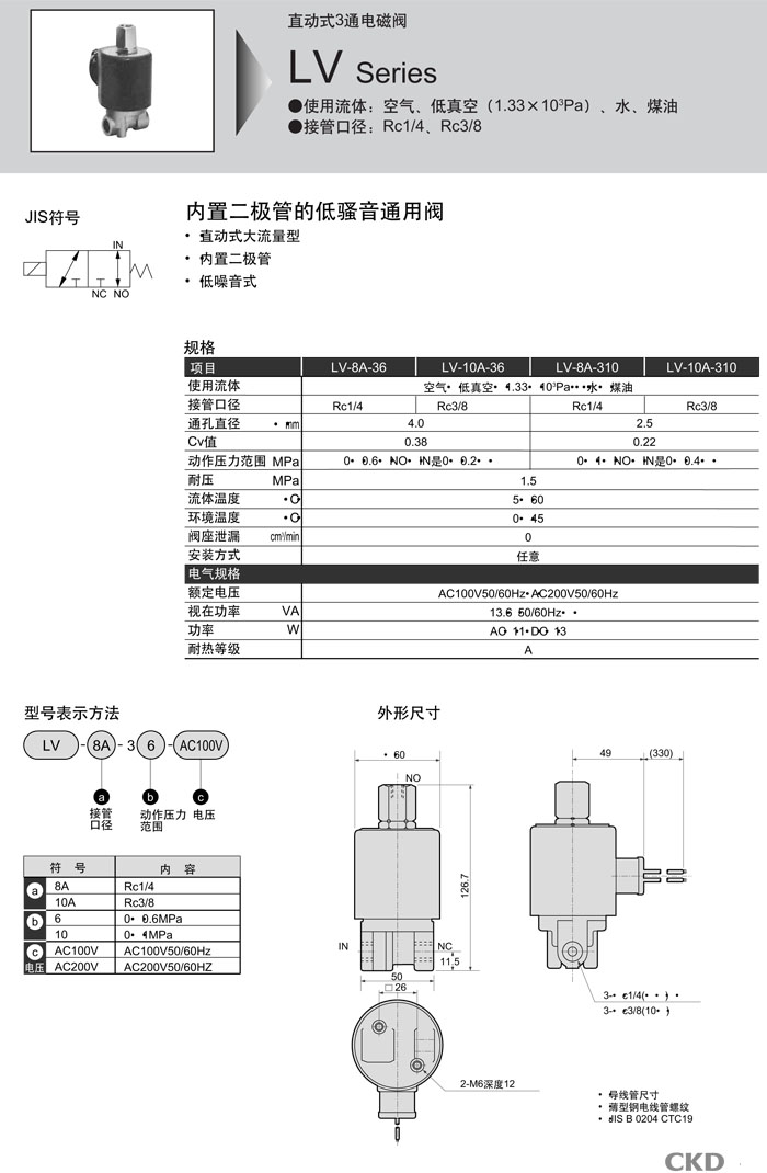 LV-8A-36,LV-10A-36,LV-8A-310,LV-10A-310,CKD直動式3通電磁閥