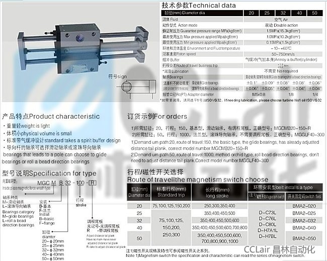 MGCLB32-250,MGCLB32-300,MGCLB32-350,MGCLB32-400,MGCLB32-450,MGCLB32-500,小型帶導桿氣缸