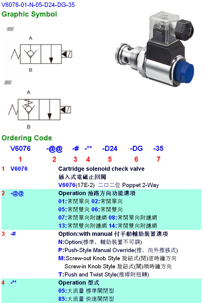 V6076-01-N-05-D24-DG-35,V6076-02,V6076-05,V6076-06,V6076-07,V6076-08,V6076-13,V6076-14,HYDROMAX插入式電磁止回閥