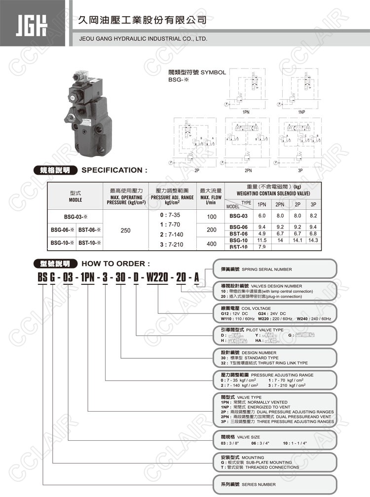 JeouGang臺灣久岡,電磁控制溢流閥BSG-03-1PN-0-30-D-G12-10-A,BSG-03-1PN-0-30-HA-G12-20-A,BSG-03-1PN-0-32-D-G24-20-A,BSG-03-1PN-1-30-Y-W220-20-A,BST-03-1PN-0-30-Y-W220- 10-A,BST-03-1PN-1-32-H-G12-10-A