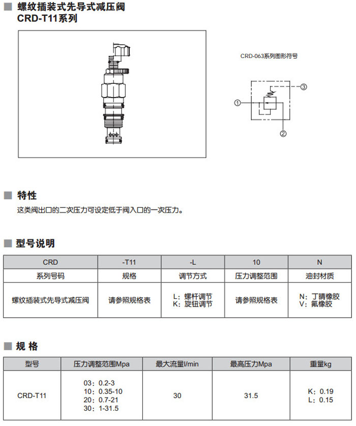 CRD-T11-L03N,CRD-T11-L10N,CRD-T11-L20N,CRD-T11-K03N,CRD-T11-K10N,CRD-T11-L30N,螺紋插裝式先導(dǎo)式減壓閥