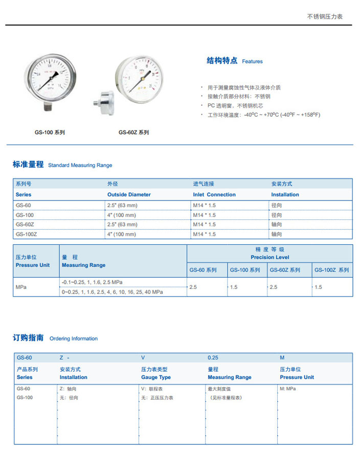 首頁 > 產(chǎn)品&解決方案 > GS-60,GS-100,GS-60Z,GS-100Z,GS-60Z-V2.5M,GS-100Z-V2.5M,不銹鋼壓力表