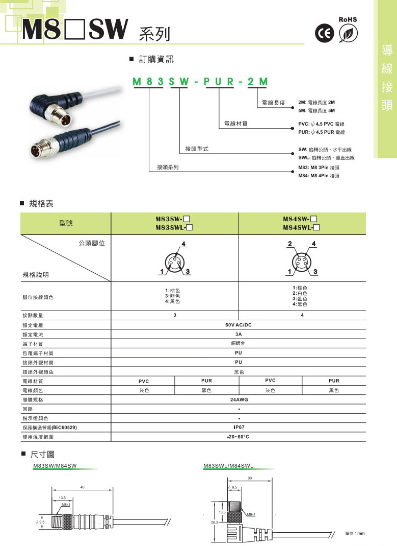 型號(hào): M83SW-PUR,M83SW-PVC,M84SW-PUR,M84SW-PVC,M83SWL-PUR,M83SWL-PVC,M84SWL-PUR,M84SWL-PVC,KIDA導(dǎo)線接頭