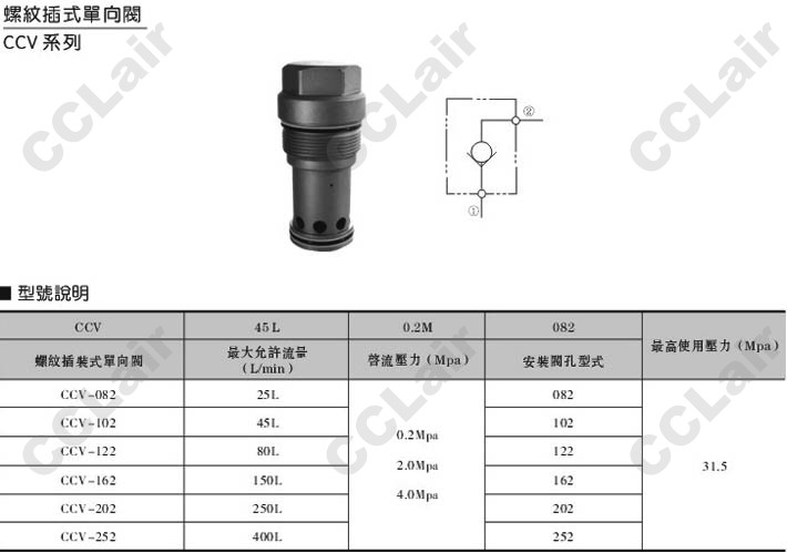 CCV-082,CCV-102,CCV-122,CCV-162,CCV-2002,CCV-252,螺紋插式單向閥