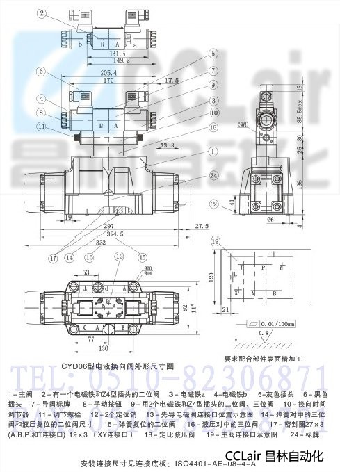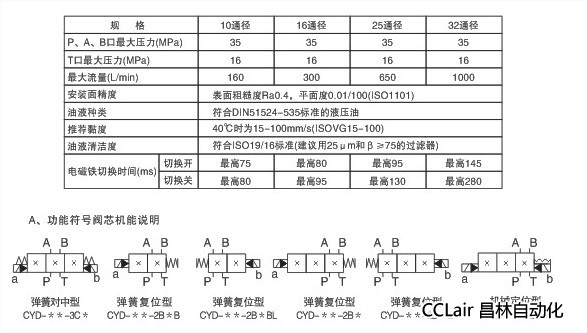 CYD系列電液換向閥有10通徑、16通徑、25通徑和32通徑尺寸規(guī)格,安裝底板符合ISO4401標(biāo)準(zhǔn)。