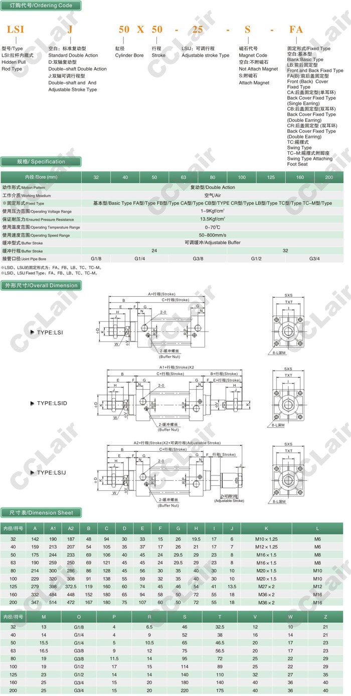 LSI32,LSI40,LSI50,LSI63,LSI80,LSI100,LSI125,LSI150,LSI200,LSI200×50,LSI50×50,標(biāo)準(zhǔn)氣缸