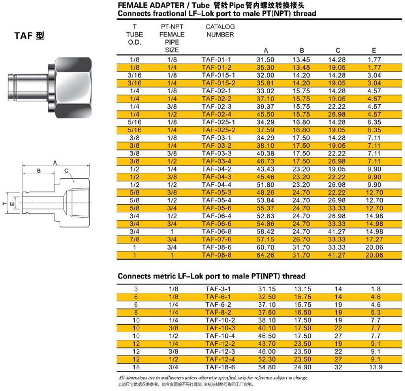 詳細(xì)信息 TAF-01-1,TAF-02-1,TAF-05-6,TAF-06-4,TAF-3-1,TAF-6-1,TAF-10-2,管內(nèi)螺紋轉(zhuǎn)換接頭