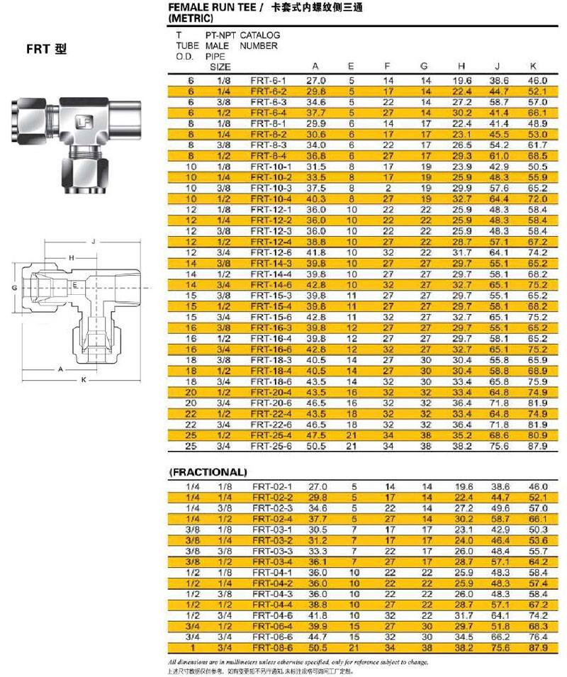 FRT-6-1,FRT-8-1,FRT-10-1,FRT-14-6,FRT-15-3,FRT-20-6,FRT-22-4,卡套式內(nèi)螺紋側(cè)三通接頭