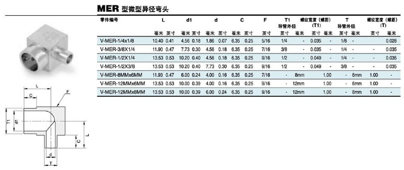 詳細信息 V-MER-1/4*1/8,V-MER-3/8*1/4,V-MER-8MM*6MM,V-MER-12MM*6MM,微型異徑彎頭