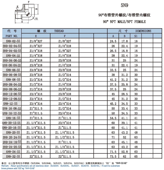 5N9-02-SS,5N9-04,5N9-06,5N9-08,5N9-12,5N9-20,5N9-32,直角內(nèi)外絲接頭