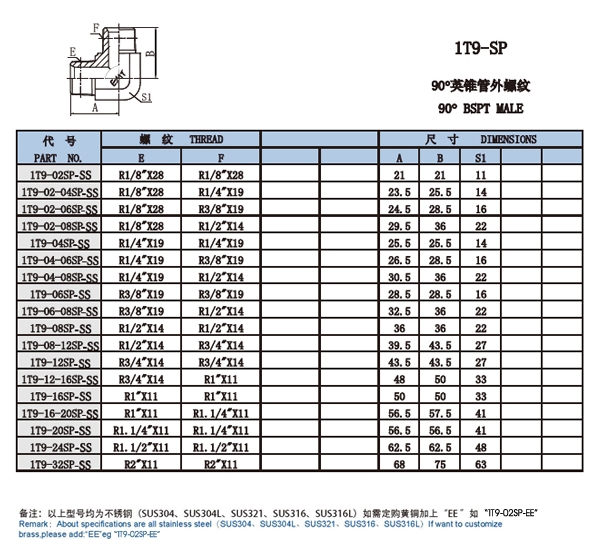 1T9-02SP-SS,1T9-04,1T9-06,1T9-08,1T9-12,1T9-20,1T9-32,直角外絲接頭