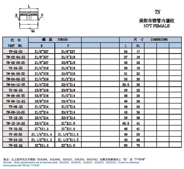 7N-02-SS,7N-04,7N-06,7N-08,7N-12,7N-16,7N-20,7N-24,7N-32,直通內(nèi)絲接頭
