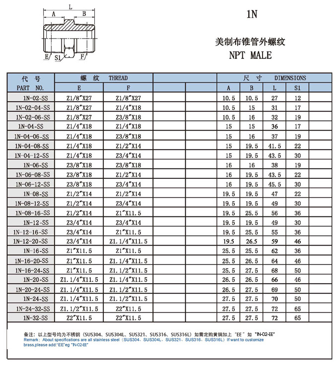 1N-02-SS,1N-04,1N-06,1N-08,1N-12,1N-16,1N-20,1N-32,1N-24,直通外絲接頭