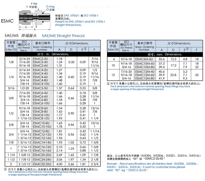 詳細(xì)信息 ESMC2-2U,ESMC4-2U,ESMC5-5U,ESMC6-4U,ESMC8-6U,ESMC10-8U,ESMC20-20U,直通終端卡套接頭