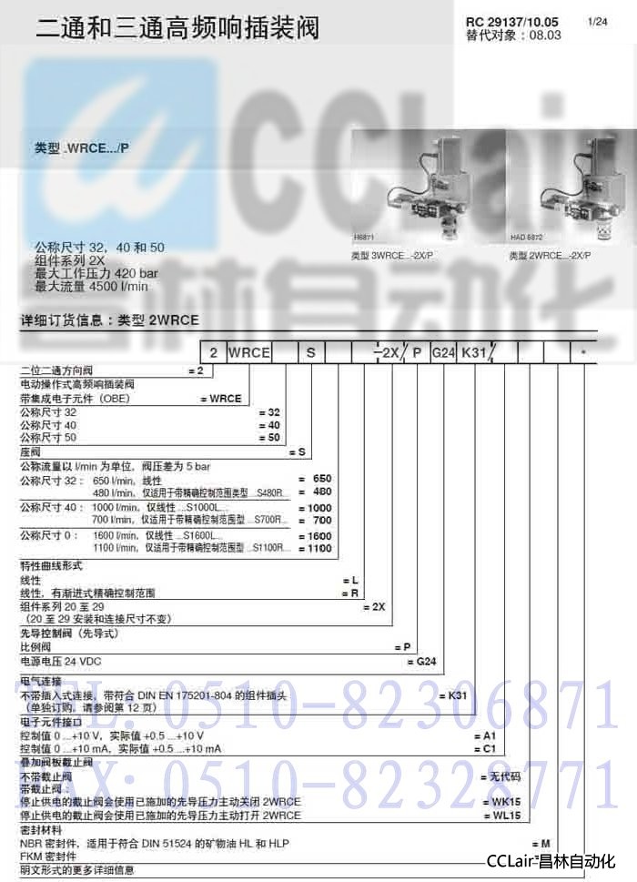 詳細信息 2WRCE32S480R-2X/PG24K31/A1WK15M,2WRCE32S650L-2X/PG24K31/C1V, ,二通和三通高頻響插裝閥,力士樂REXROTH,德國力士樂