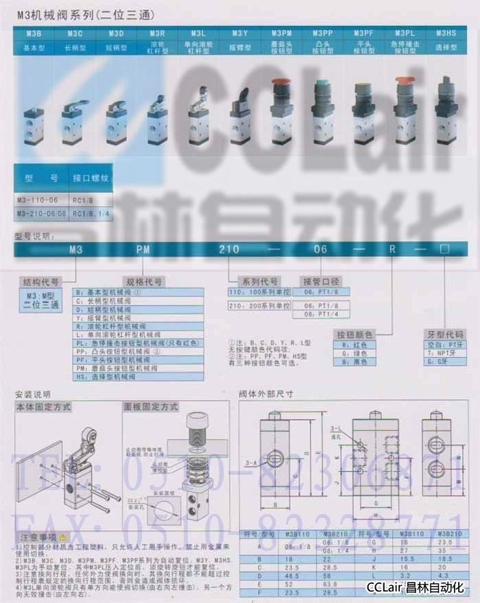 M3HS110-06,M3HS210-08,M3HS210-06,M3PM110-06,二位三通機械閥