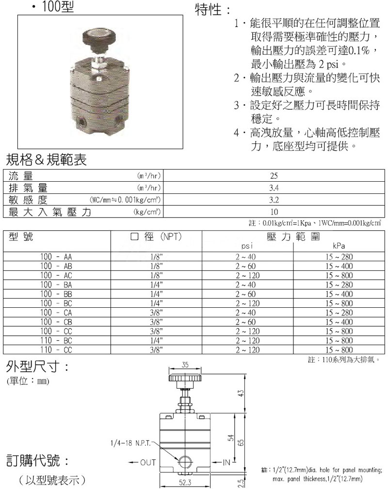 詳細(xì)信息 100-AA,100-AB,100-AC,100-BA,100-BB,100-BC,100-CA,panix精密調(diào)壓閥
