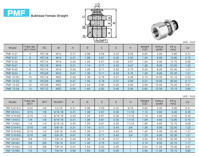 PMF5/32-N1U,PMF3/16-N1U,PMF1/4-N1U,PMF5/16-N1U,PMF3/8-N2U,PMF1/2-N3U,PMF3/16-N2U,PISCO快速接頭