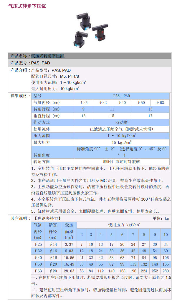 PAS-25,PAS-32,PAS-40,PAS-50,PAS-63,PAD-25,PAD-32,PAD-40,PAD-50,PAD-63,POSU氣壓式轉(zhuǎn)角下壓缸