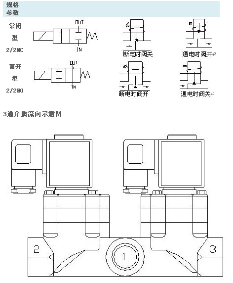 2:當電磁閥線圈斷電時,1與2關(guān)閉,1通向3。