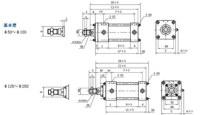 | 氣缸內(nèi)徑(mm) | KK | K | LF | LL | MM | P | RE | RR | VF | W | WF | YP | ZB | ZJ |