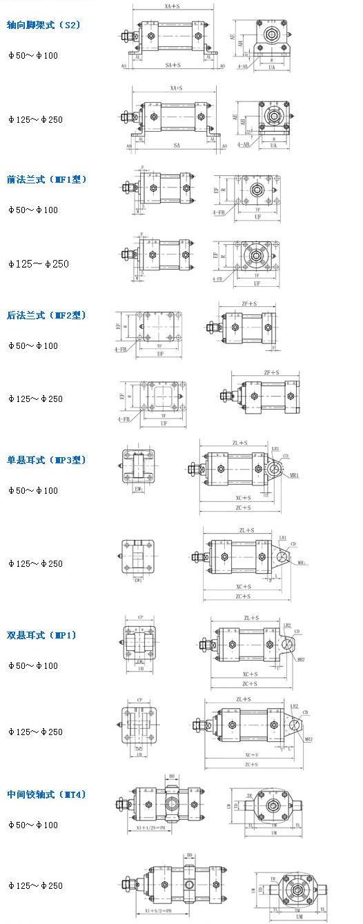 | 氣缸內(nèi)徑φ(mm) | MT4型 | TD | TL | TM | TR | UM | UW | XI | T | W | ZF | F | |