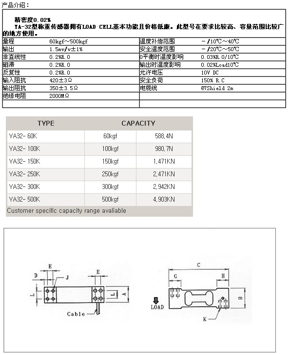 詳細(xì)信息 YA32-60K,YA32-100K,YA32-150K,YA32-250K,YA32-300K,YA32-500K,setech稱重傳感器