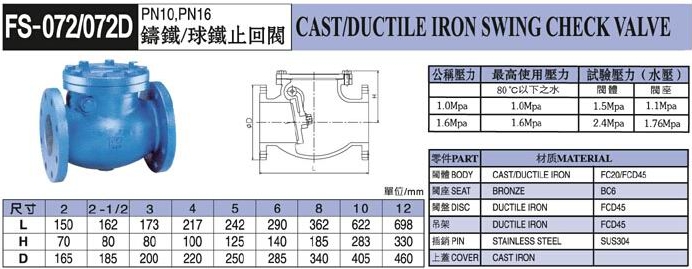 FS072鑄鐵橫式止回閥由閥體、閥蓋及橡膠瓣三種主要零件組成。其中橡膠瓣由鋼板、鋼棒及強化尼龍布作襯底,外層披覆橡膠制成,閥瓣開關壽命可達100萬次,該閥采用全流面積式設計,具有水頭損失小,不易堆積雜物,維修簡單。該閥主要適用于給排水系統(tǒng),可安裝于水泵出水口處,以防止倒流及水錘對泵損害。該閥還可安裝在蓄水池進出水管的旁通管上,以防止池水倒流至給水系統(tǒng)中。