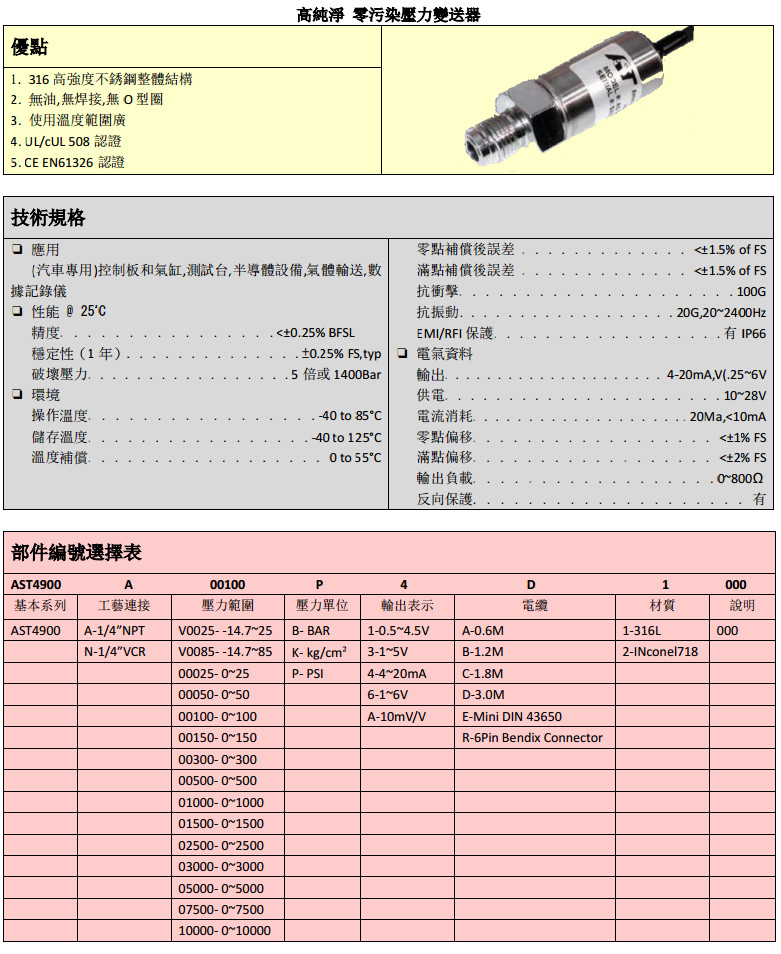 AST4900-A-V0025,AST4900-A-03000,AST4900-N-00150,AST4900-N-10000,高純凈壓力變送器