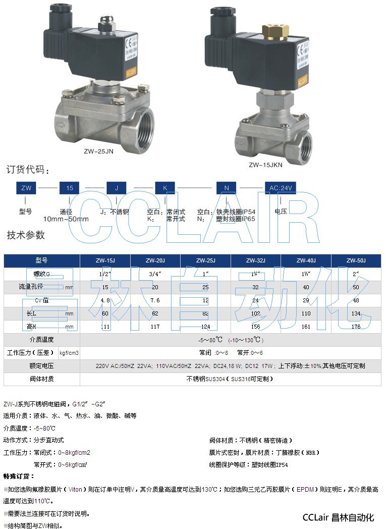 詳細(xì)信息 ZW-15J,ZW-20J,ZW-25J,ZW-32J,ZW-40J,ZW-50J,不銹鋼電磁閥,G1/2〞~G2