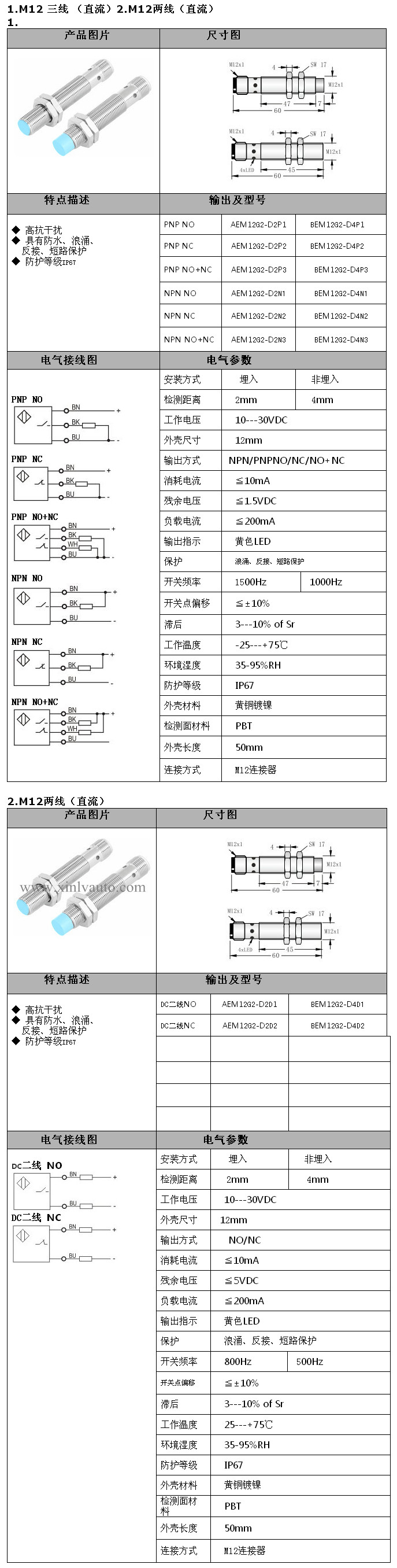 詳細(xì)信息 AEM12G2-D2P1,AEM12G2-D2N3,BEM12G2-D4P1,BEM12G2-D4N1,BEM12G2-D4D2,接插式M12直流三二線接近開關(guān)