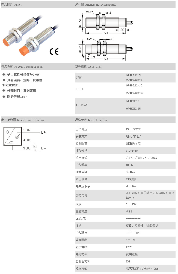 詳細信息 霍爾式線性傳感器 HG-MHL12-5,HG-MHL12M-5,HG-MHL12-10,HG-MHL12M-10,HG-MDHL12,HG-MDHL12M,