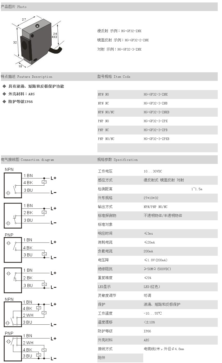 詳細(xì)信息 方型光電開關(guān)/傳感器 HG-GF32-3-ZNK,HG-GF32-3-ZNB,HG-GF32-3-ZNKB,HG-GF32-3-ZPK,HG-GF32-3-ZPB,HG-GF32-3-ZPKB,