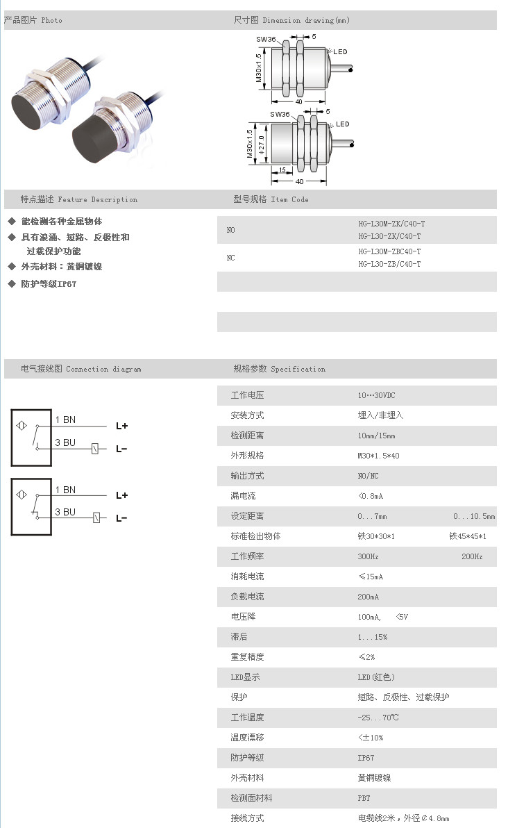 詳細(xì)信息 防水/防油/防腐蝕接近開關(guān) HG-L30M-ZK/C40-T,HG-L30-ZK/C40-T,HG-L30M-ZBC40-T,HG-L30-ZB/C40-T,