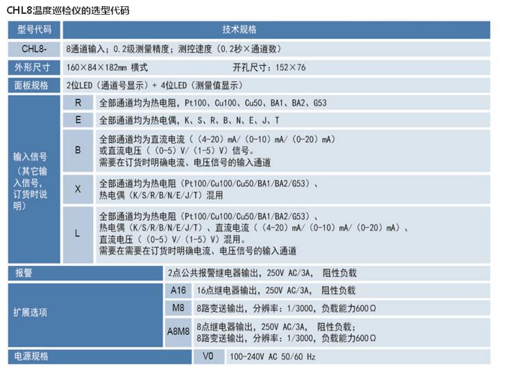 CHL8溫度巡檢儀的基本性能 ■0.2級精度,測控速度每通道0.2秒 ■8通道輸入,可輸入熱電阻,熱電偶,直流電流,直流電壓信號。 ■可選配8路變送輸出,實現(xiàn)8個輸入信號的變送輸出。 ■可選配8點報警輸出或16點(無變送輸出時)報警輸出,實現(xiàn)每通道1點或2點報警輸出。