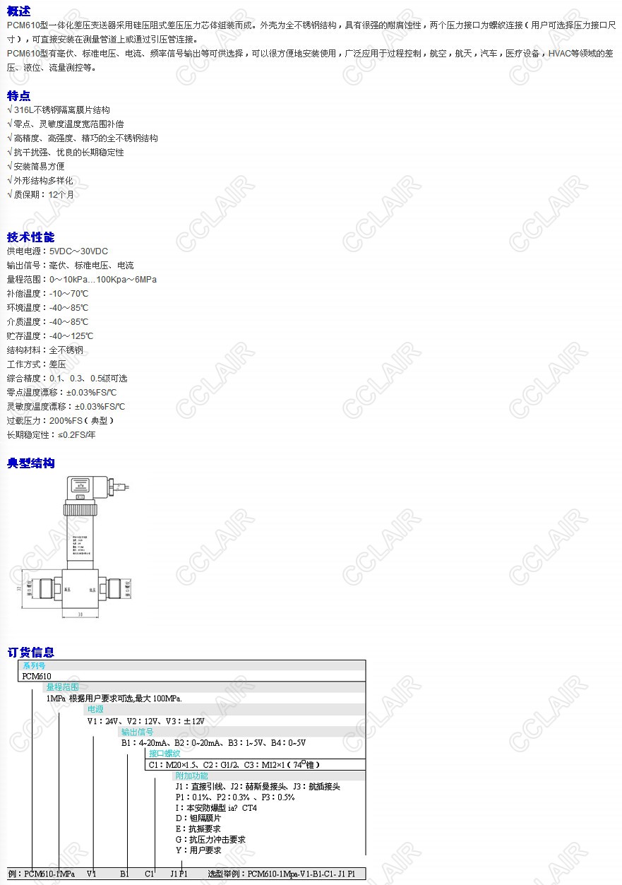 PCM610-10MPa-V1-B1-C1,PCM610-10MPa-V1-B1-C2,PCM610-10MPa-V1-B1-C3,PCM610-10MPa-V1-B2-C1,PCM610差壓變送器